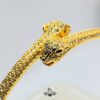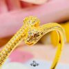 طرح: این بنگل دستبندی هست که مدل النگو استفاده میشود و بر روی آن دو سر ببر وجود دارد که مثل اینکه دارن همدیگر و بوس میکنند کار تا نیمه شامل مخراجکاری هست با نگینهای سواروسکی سفید و روی چشمهای ببرها نگین سبز کار شده و این بنگل شامل قفل میباشد.